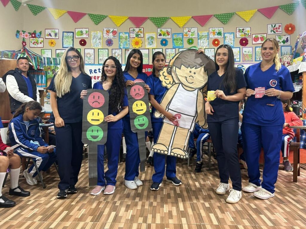 Durante a ação, as crianças participaram de atividades lúdicas organizadas em quatro estações temáticas: higiene das mãos, cuidados com o corpo no banho, orientações gerais de saúde e uma abordagem sobre “o toque”, voltada à conscientização sobre limites corporais e prevenção de abusos.