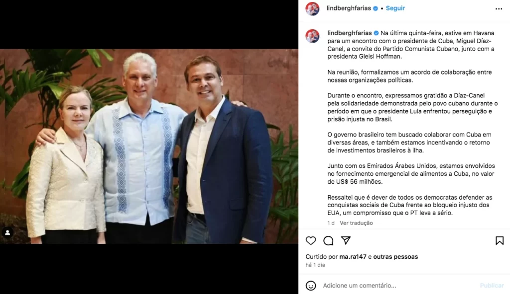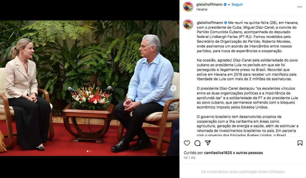 Durante sua visita ao país caribenho, Gleisi teve a oportunidade de se reunir com o presidente Miguel Diáz-Canel. No encontro, também estava presente o deputado federal Lindbergh Farias (PT-RJ). A líder do PT compartilhou em suas redes sociais que durante a reunião manifestou ao líder cubano o interesse do Brasil em dialogar e auxiliar Cuba diante do bloqueio que o país enfrenta.