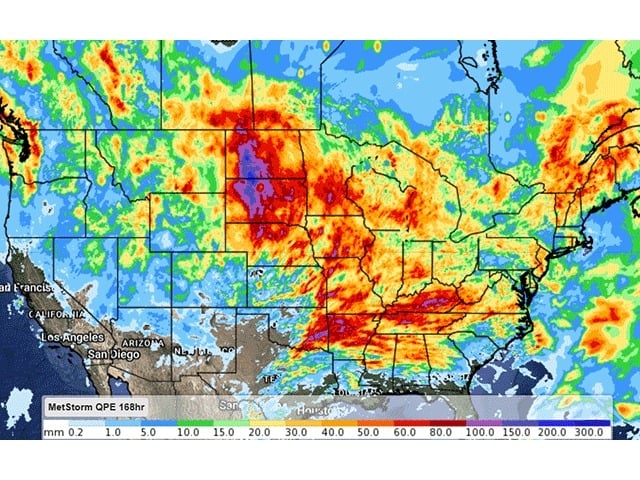 Nos Estados Unidos, o avanço do plantio vinha tranquilo… até que duas frentes de tempestade atravessaram o sul do Corn Belt entre domingo e terça-feira. Estados como Missouri, Kentucky, Arkansas e partes do Tennessee registraram de 75 mm a 125 mm de chuva em áreas críticas de milho recém-semeado.