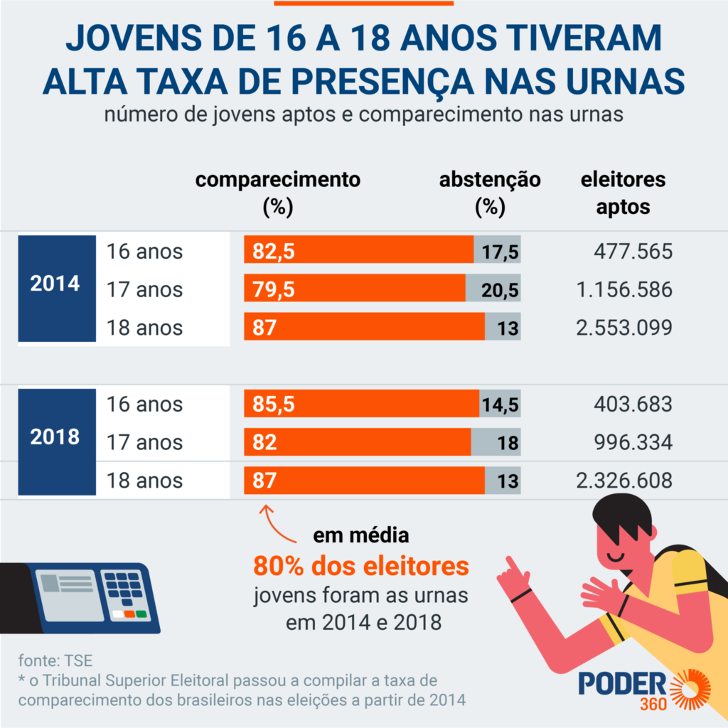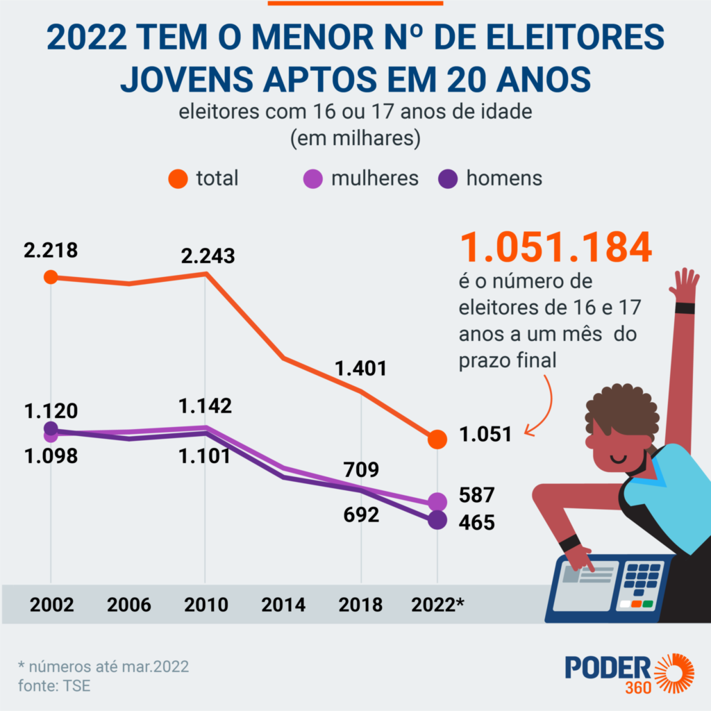 Até março, dados do TSE (Tribunal Superior Eleitoral) indicavam que 2022 registrou 1.051.000 jovens, entre 16 e 17 anos, com título de eleitor. Era o menor número de adolescentes aptos a votar em 20 anos. Em 2002, o país tinha 2.218.000 pessoas nessa faixa etária.