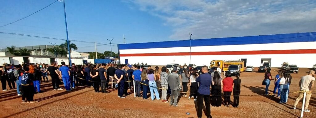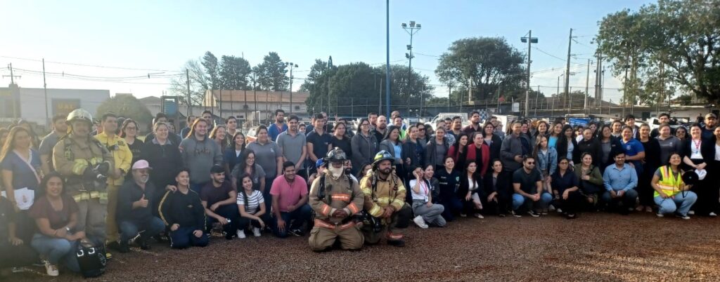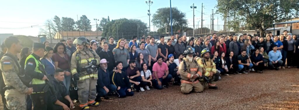 No local, ação emergencial rápida e eficaz com sinal de emergência e evacuação com apito, saída dos colaboradores administrativos e ocupantes do prédio. Rapidamente, o treinamento contou com a chegada da viatura e equipe do Corpo de Bombeiros Voluntários Amarelo de Pedro Juan Caballero.